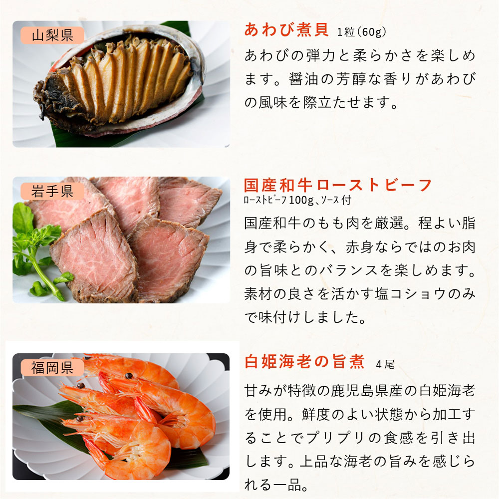 全国の美味しい物が個包装で届けられるため、他の料理の味や匂いなどが移ることがなく、それぞれをじっくり味わえます。とても美味しいです。ここ数年リピートしています。