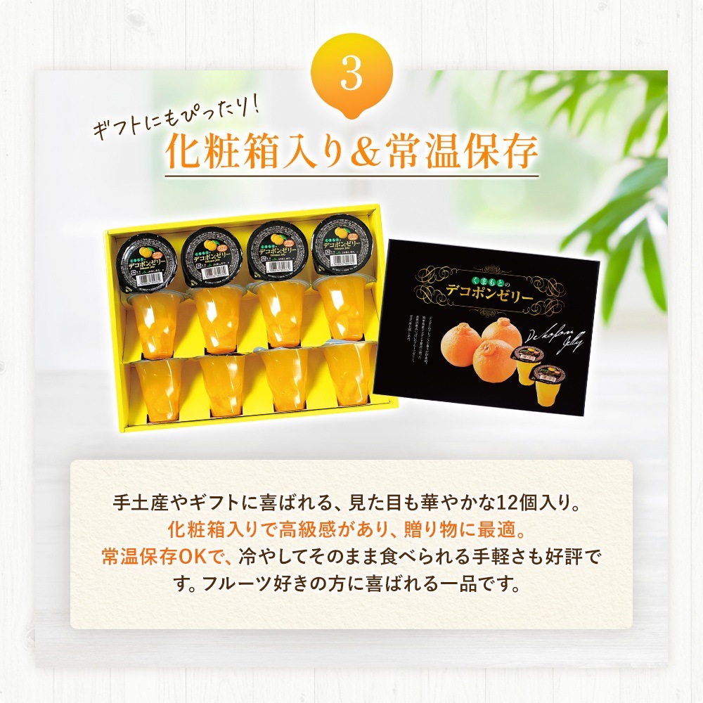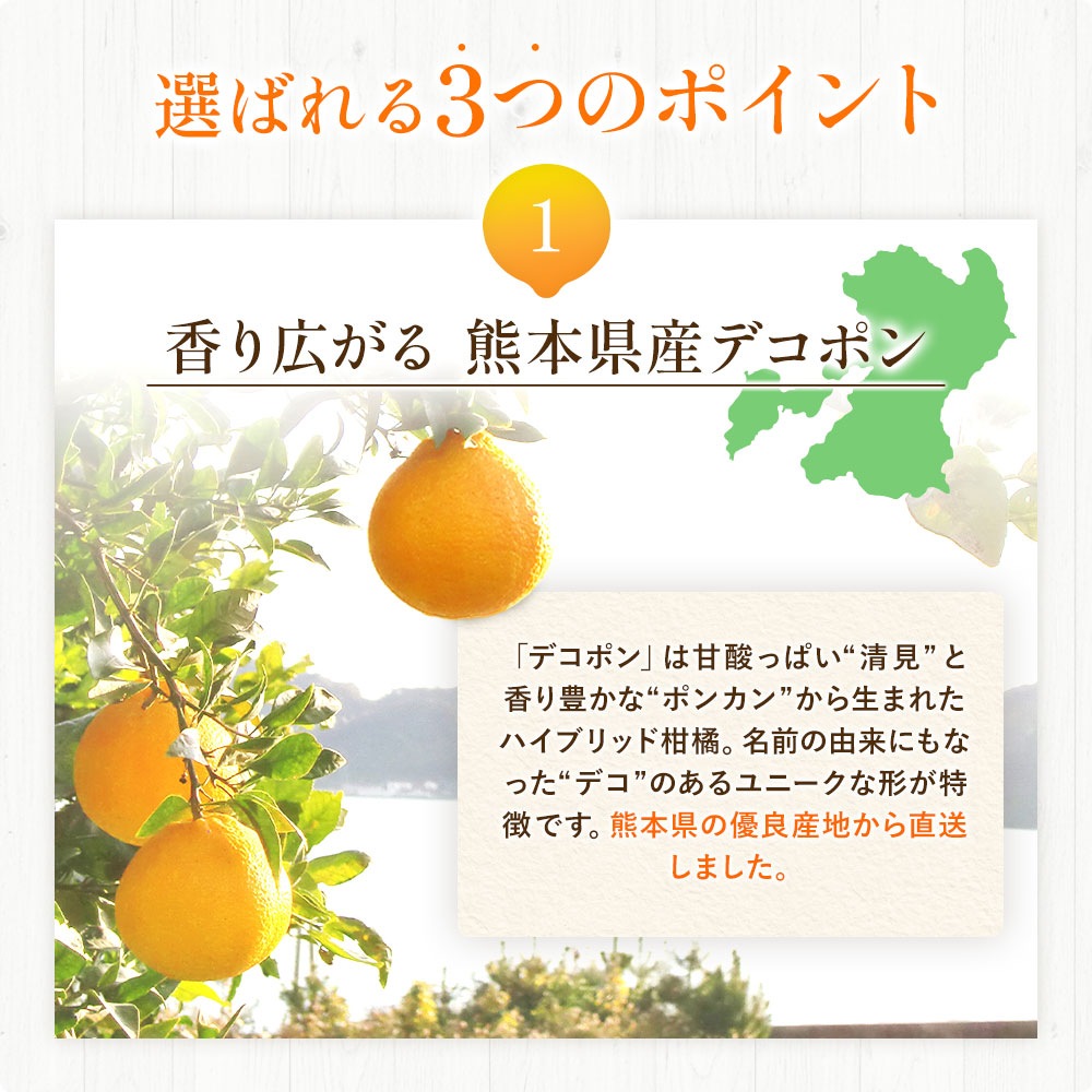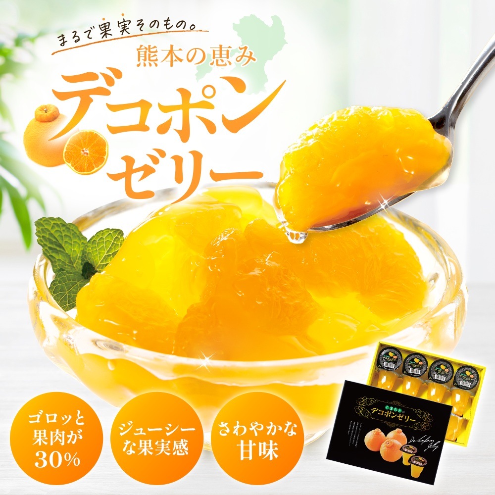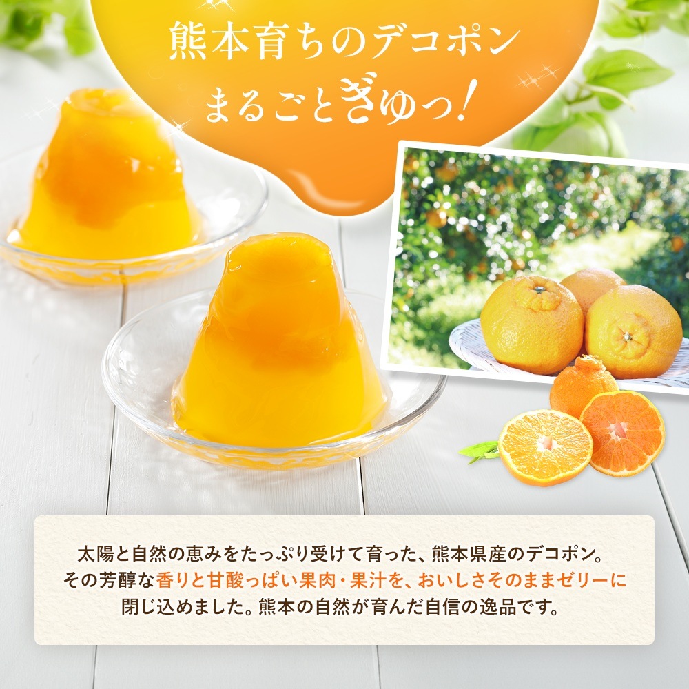贈り物にぴったりの熊本の恵み、瑞々しいデコポンをぎゅっと詰め込んだデコポンゼリー。 JA熊本のデコポンを丁寧に加工し、果肉と果汁をたっぷりと使用。 デコポンの風味を最大限に引き出すため、果実の状態を大切にし新鮮な状態で加工しています。熊本県産のデコポンを贅沢に使用し、濃厚な味わいと豊かな香りが特徴です。一口食べれば、まるでデコポンをそのまま頬張っているかのような幸福感に包まれます。贅沢なデコポンの風味と口溶けの良さをお楽しみください。