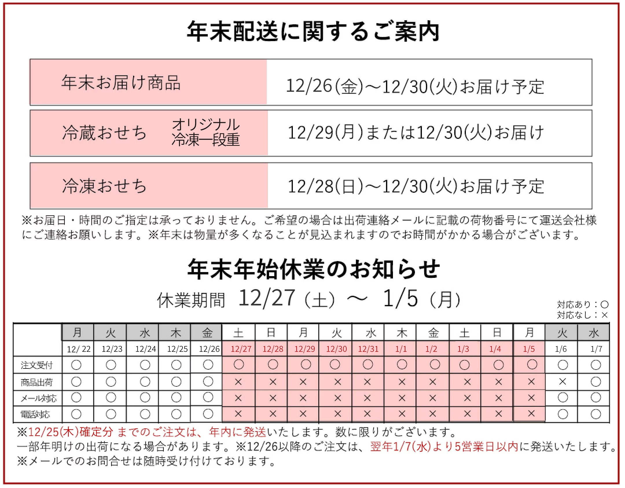 〇配送日時指定について 年末年始期間は、道路の混雑・渋滞が予想されるため、配送日時をご指定いただいてもご希望に添えない場合がございます。